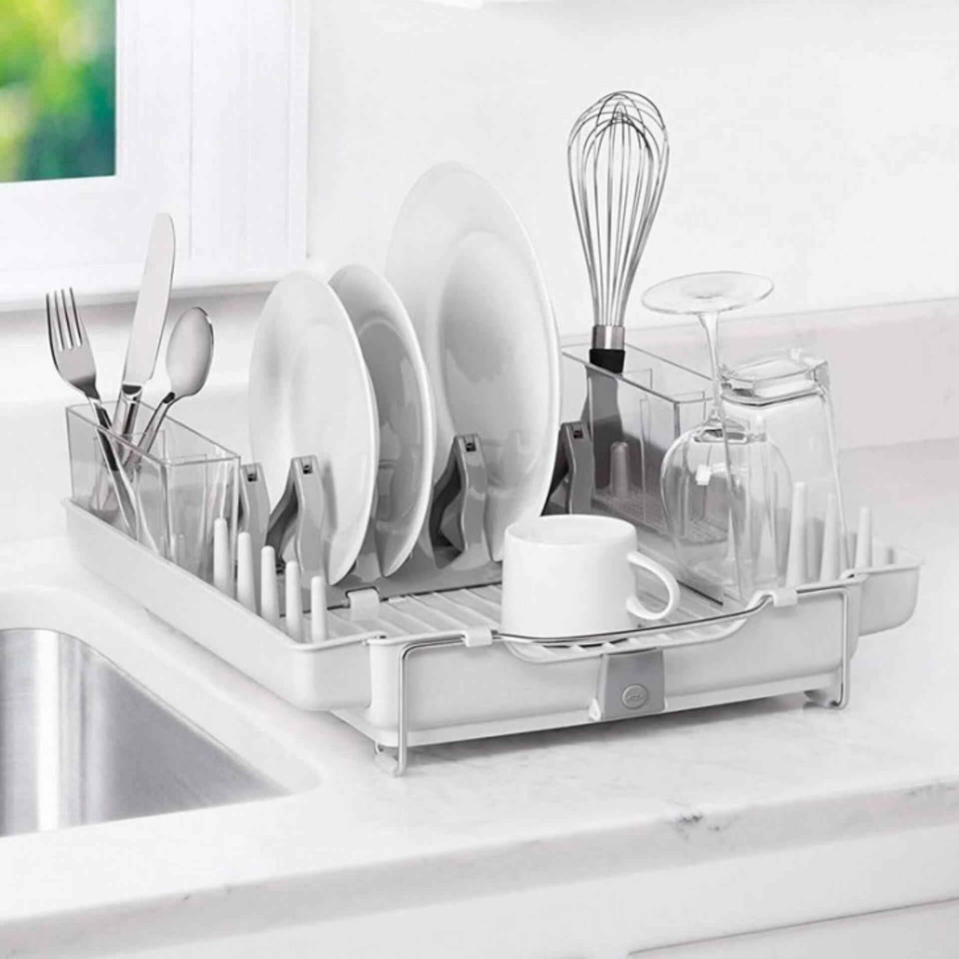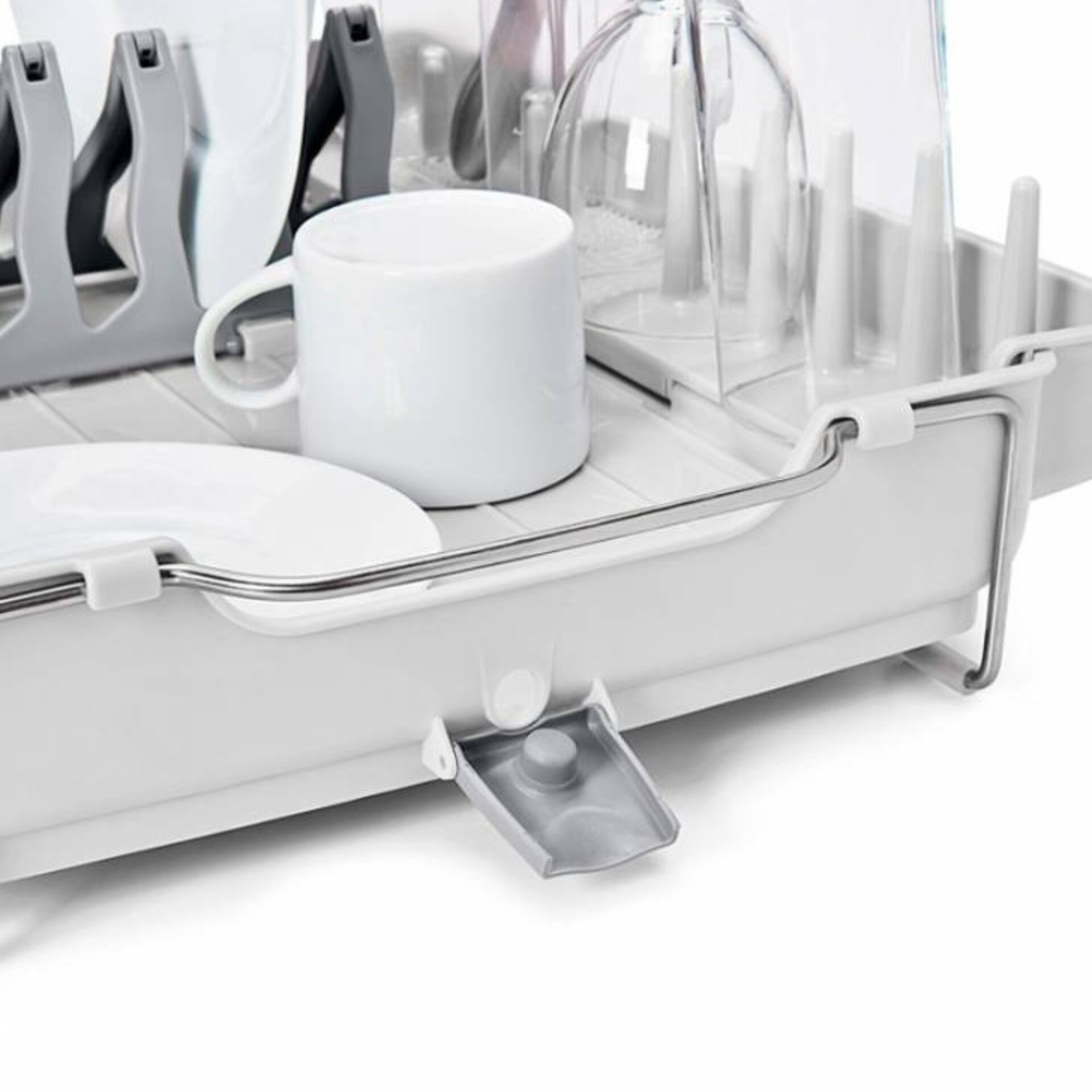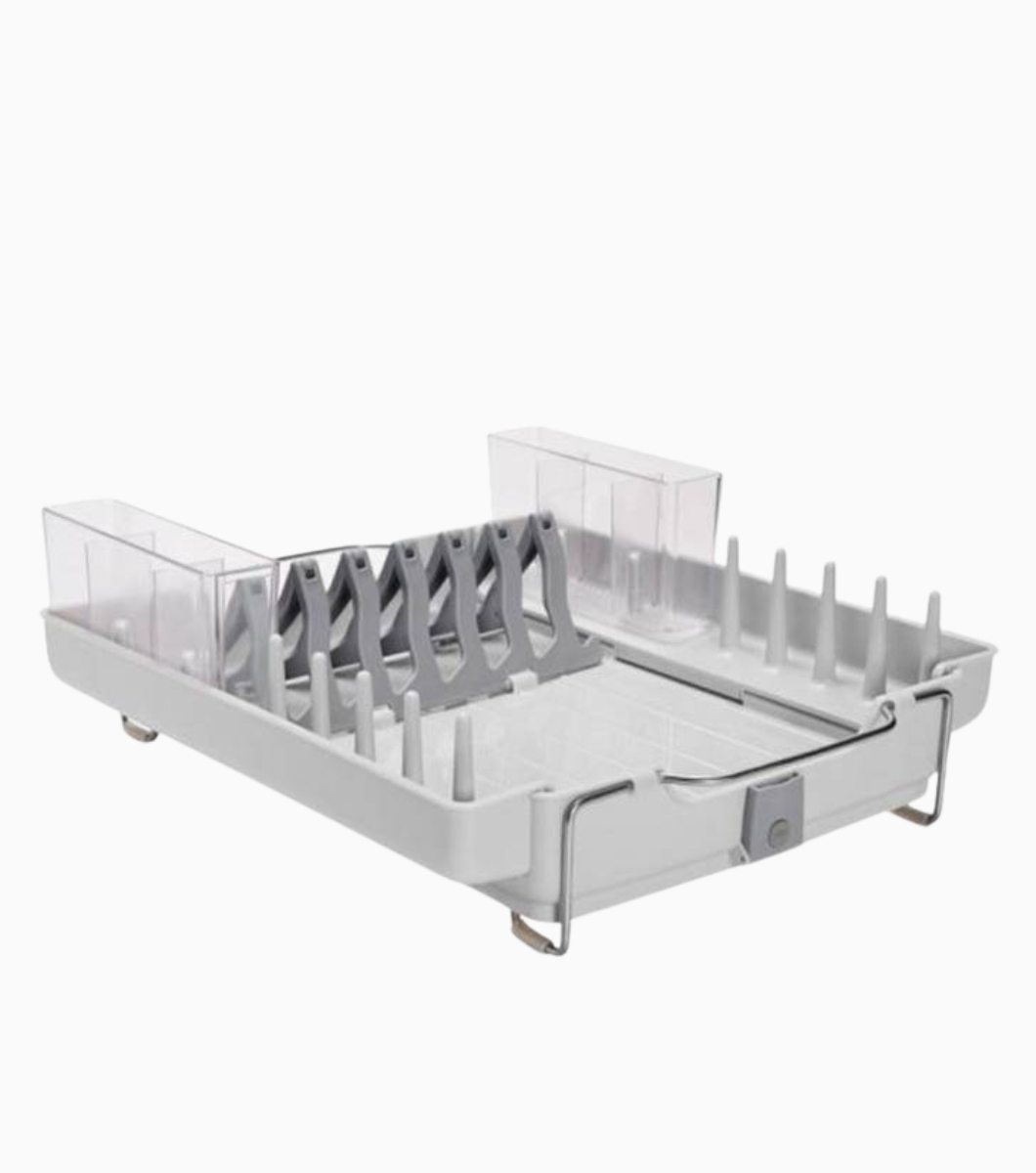 Este innovador secaplatos de acero inoxidable se ajusta de acuerdo al tamaño de tus utensilios y permitiendo un drenado fácil por su tapón de silicona. ¡Diseño flexible y funcional que optimiza tu espacio!