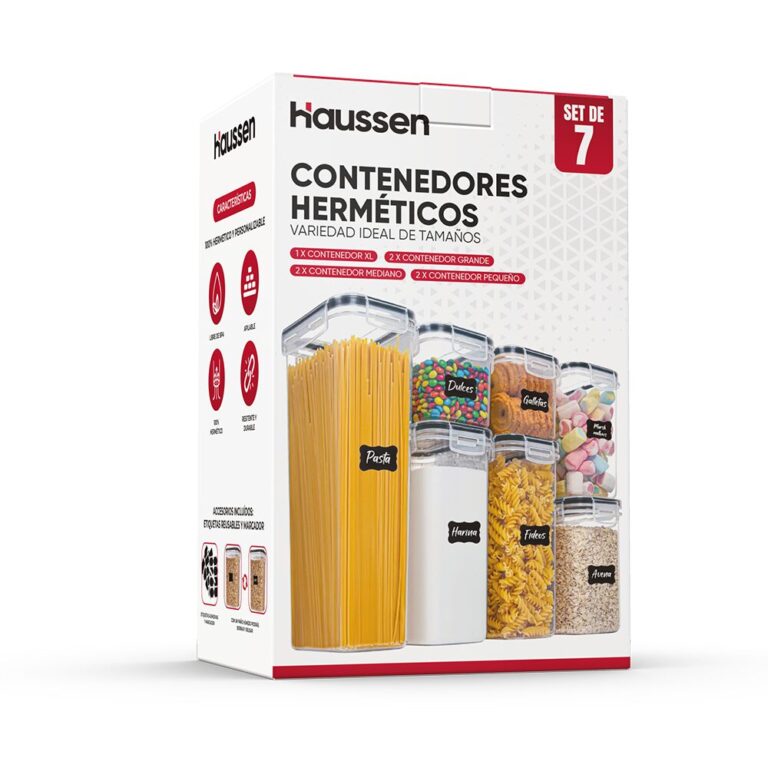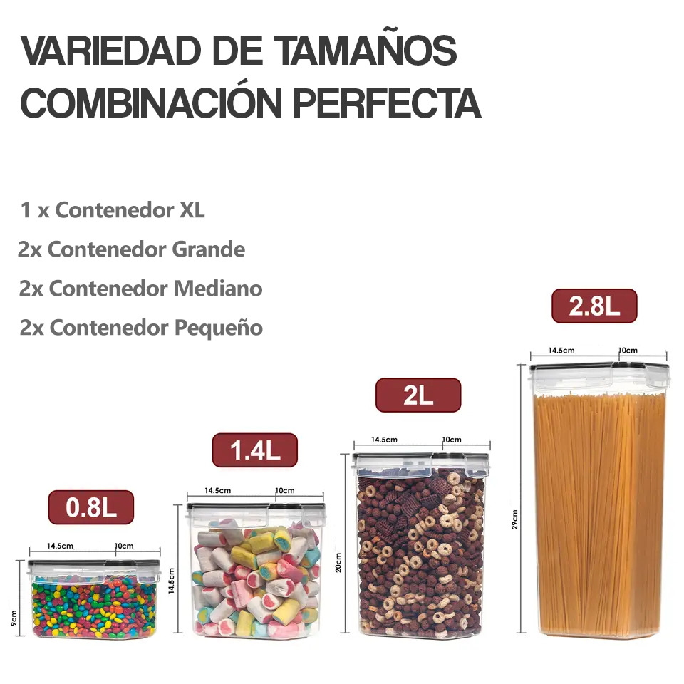 Opciones versátiles para guardar desde pequeñas porciones hasta grandes cantidades de alimentos. Además, su diseño apilable optimiza el espacio en tu despensa